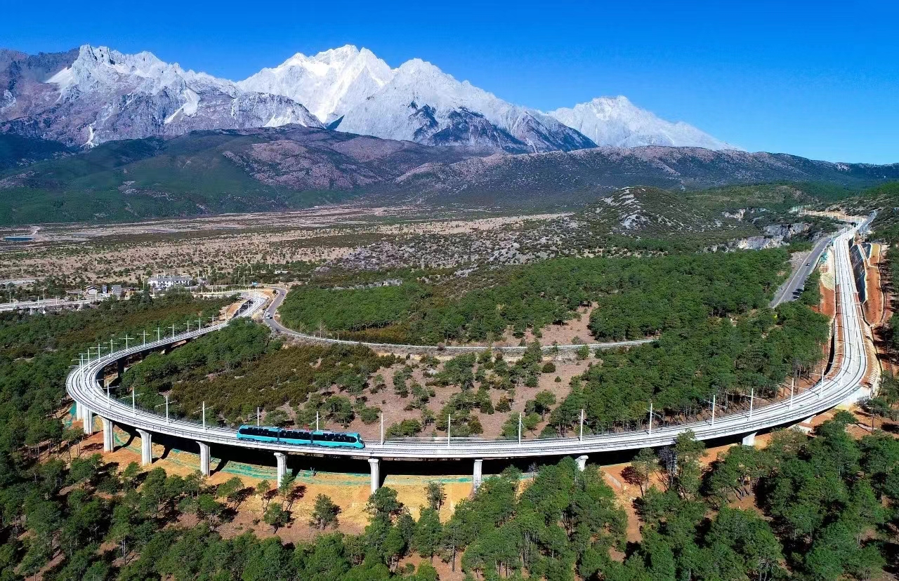 丽江城市综合轨道交通项目一期工程位于丽江玉龙雪山南侧玉龙县境内,南起游客中心站,北至玉龙雪山站,主要沿丽鸣公路布设,共设置车站5座,串联了游客中心、白沙古镇、玉水寨、东巴谷及甘海子服务区等主要旅游景区及客流集散点。游客乘坐轻轨,仿佛置身于“天空之城”,可将玉龙雪山沿途美景尽收眼底。