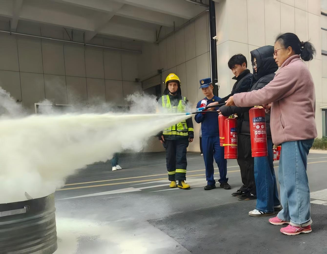 在技能实操环节,消防指战员与园区安全员重点讲解示范了三大关键技能:防火面罩“开盒、佩戴、收紧”的快速佩戴方法;灭火器“提、拔、握、压”的操作口诀与实操灭火;室内消火栓的快速启用及水带连接、展开技巧。员工们分批进行动手操作,真正实现了从“知道”到“会用”的转化。