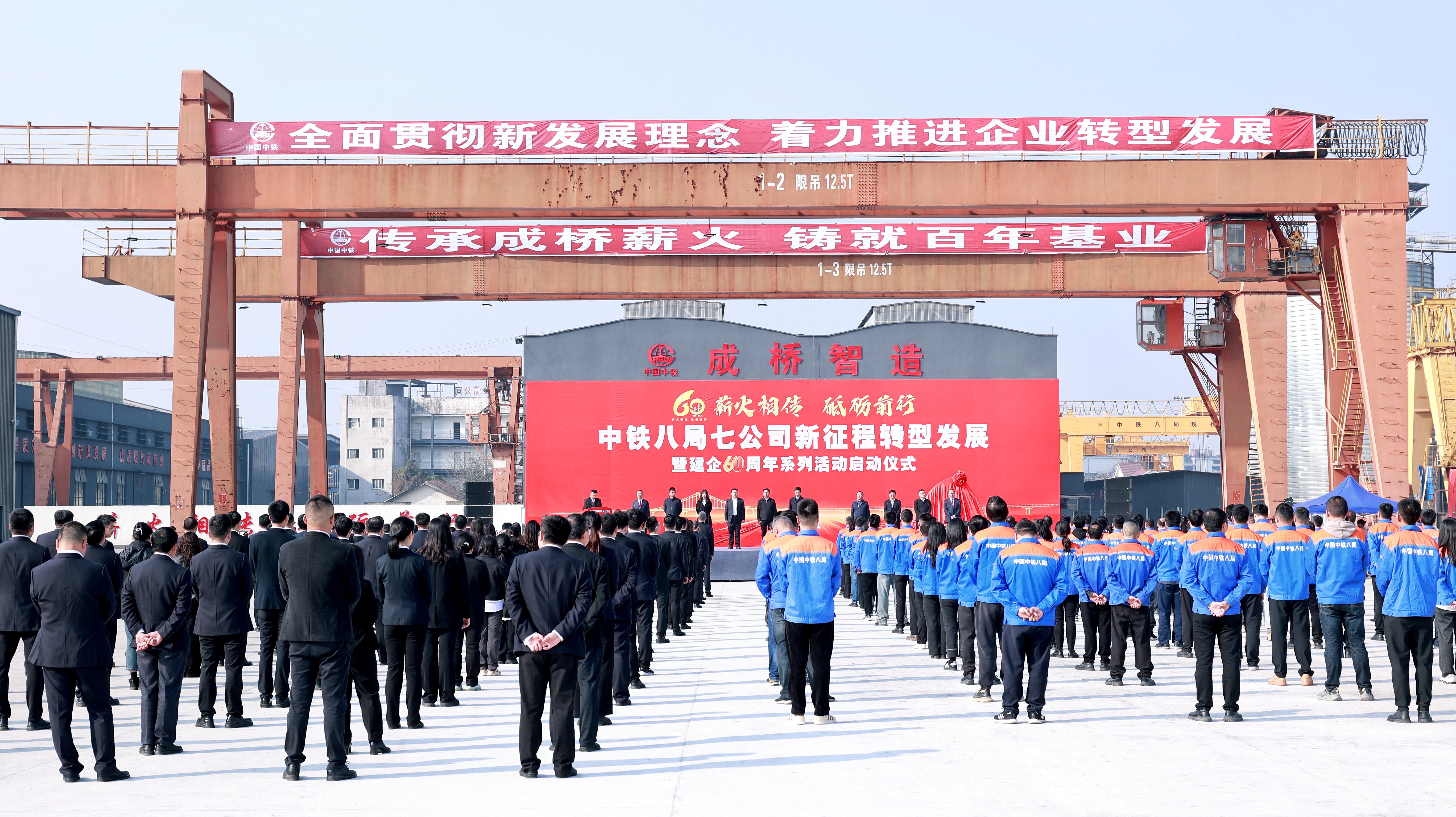 在热烈的掌声中,出席仪式的各位领导共同为活动标识揭牌,标志着中铁八局七公司以六十载奋斗历程为新起点,正式吹响新征程转型发展的冲锋号角。