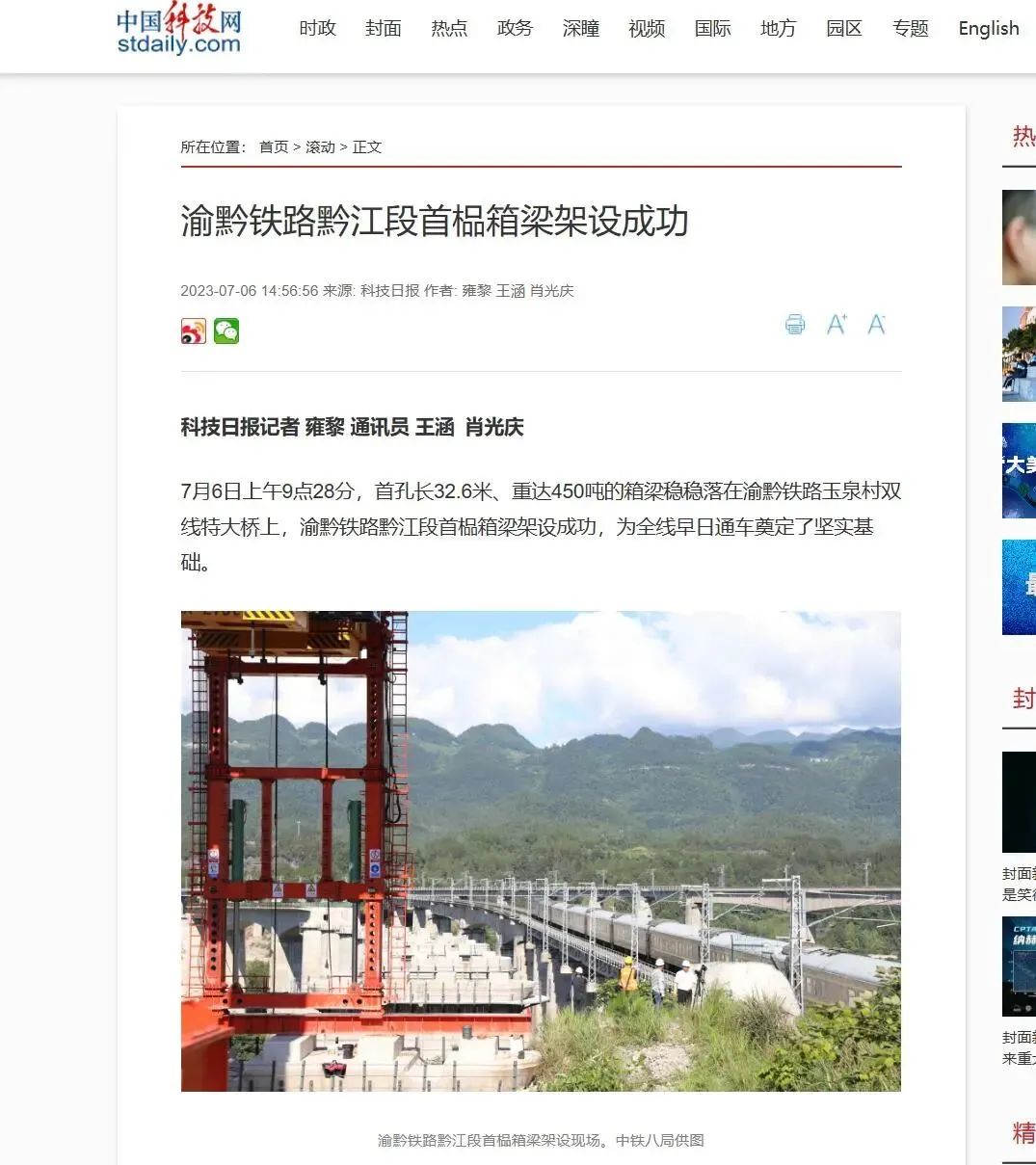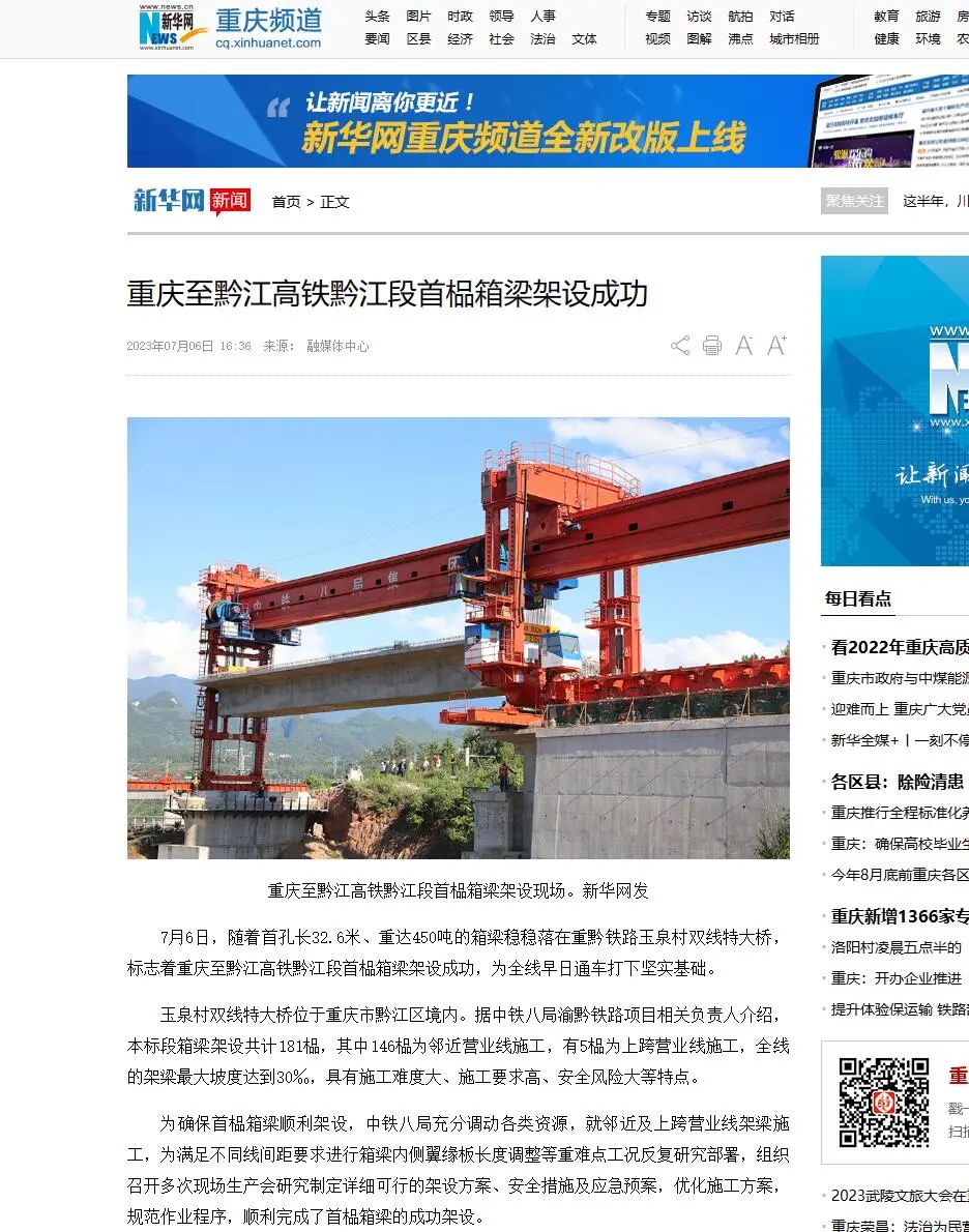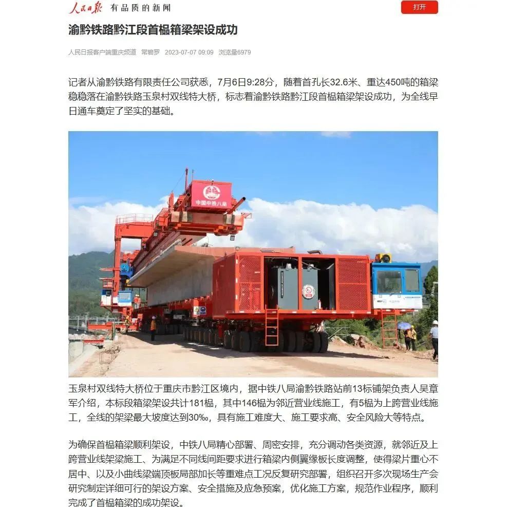 7月6日9时28分,随着首孔长32.6米、重达450吨的箱梁稳稳落在渝黔铁路玉泉村双线特大桥,由中铁八局参建的渝黔铁路黔江段首榀箱梁架设成功,为全线早日通车奠定了坚实的基础。