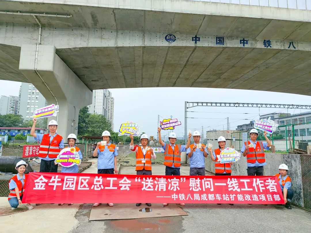 现场员工纷纷表示,十分感谢金牛园区总工会带给他们的关怀,天气虽然很炎热,但是心里却“凉快”。下一步,成都北站项目部将再接再厉,继续发扬“开路先锋”精神,积极推动商贸大道涉铁路及地铁施工、东西下穿深基坑框架施工、成渝中线动走沙河特大桥等成都车站扩能改造及相关工程建设,做到保安全、保质量、期到必成,全力推进项目建设,为成都市经济发展和金牛区建设贡献中铁八局力量。